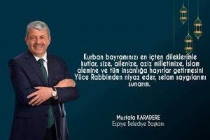 Mustafa Karadere mesajında, “İslam aleminin ve tüm insanlığın birlik ve beraberlik içerisinde huzurlu ve mutlu bir Kurban Bayramı geçirmesini temenni ediyorum” dedi. Bayramlar insanlar arasındaki karşılıklı sevgi ve saygının perçinlendiği, insanların birbirleriyle olan dargınlıklarını unuttukları, barıştıkları, kardeşçe kucaklaştığı, milli ve dini duyguların, inançların, örf ve adetlerin uygulanıp sergilendiği, bir toplumda millet olma şuurunun şekillendiği, kuvvetlendiği günlerdir.